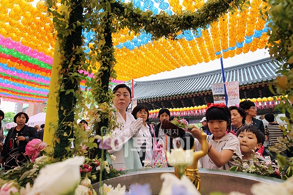 부처님 오신날을 이틀 앞둔 8일 오후 서울 종로구 견지동 조계사에서 어린이들이 관불의식을 하며 축제를 즐기고 있다.