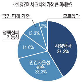 현 정부 물가정책의 가장 큰 폐해에 대한 물음에는‘시장 왜곡’이 37.3%로 가장 높은 비율을 차지했고,‘민간 자율성 훼손’ 33.3%, ‘정책실패 가능성’ 14.0%, ‘국민 피해 가중’ 13.3% 등이 뒤를 이었다.