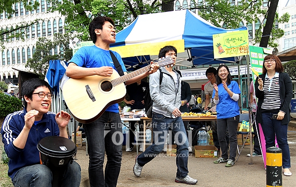 연세대학교 학생들이 12일 오후 서울 신촌 연세대에서 열린 축제를 보며 즐거운 시간을 보내고 있다.