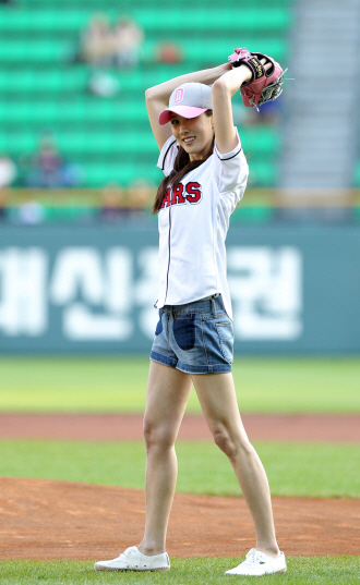 배우 이수경이 지난 13일 서울 송파구 잠실동 잠실야구장에서 열린 프로야구 두산베어스와 SK와이번스와의 경기에서 시구자로 나서 공을 던지고 있다.