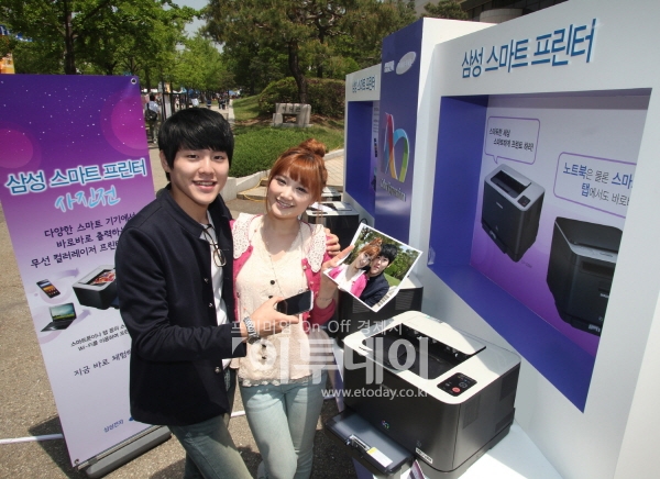 ▲삼성전자 모델들이 13일 첫 행사가 열린 신촌 연세대학교에서 '삼성 스마트 프린터 사진전'을 소개하고 있다.(삼성전자)