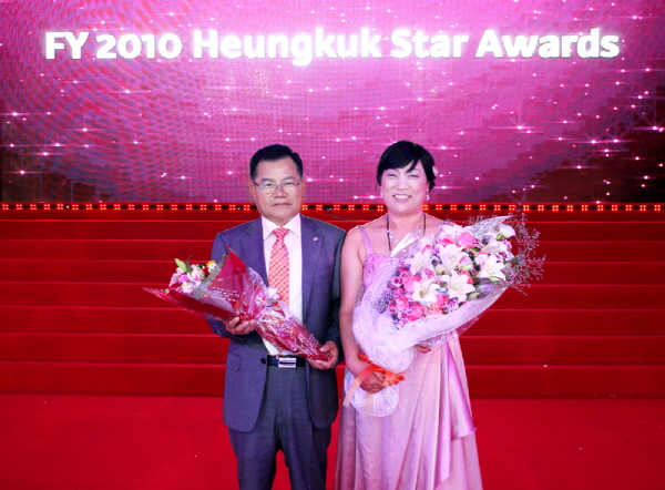 ▲흥국생명과 흥국화재는 지난 13일 대전 컨벤션센터에서 'FY2010 연도대상 시상식'을 개최했다. 흥국생명 연도대상 수상자인 수원지점 김선옥 FC(사진 우측)와 흥국화재 연도대상 수상자 해남지점 한승만 FC가 기념 촬영을 하고 있다.
