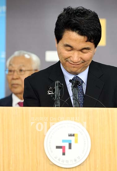 이주호 교육과학기술부 장관이 16일 오후 정부중앙청사에서 국제과학비즈니스벨트 입지 선정 결과를 공식 발표하는 가운데 취재진으로부터 거점지구 사전 유출에 관한 질문을 받고 묘한 표정을 짓고 있다. 교육과학기술부 과학벨트 입지평가위원회는 이날 오전 회의를 열어 과학벨트 거점지구 입지로 대전 대덕연구개발특구를 선정했다고 밝혔다.
