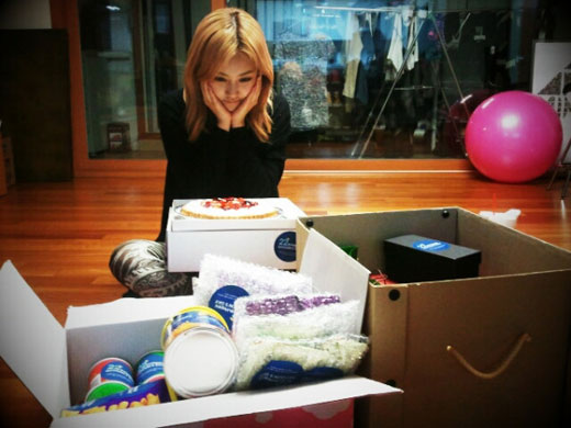 사진 속 편안한 차림으로 거실에 앉아 선물 꾸러미 앞에 앉아 있다. 그는 화장하지 않은 수수한 민낯으로 선물앞에서 감격스러운 표정으로 짓고 있다.