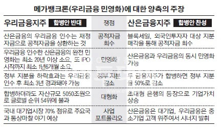 논란은 메가뱅크론의 적절성으로까지 번지고 있다. 산은금융이 “메가뱅크가 탄생하면 기업가치가 상승해 투자 유치도 수월해질 것”이라는 낙관적 전망을 낸 데 대해, 우리금융은 “관치금융과 정부 간섭으로 몸살을 앓고 있는 국내 금융산업의 현실을 감안할 때 국책은행으로 글로벌 경쟁력을 확보하는 것은 요원하다”고 반박했다.