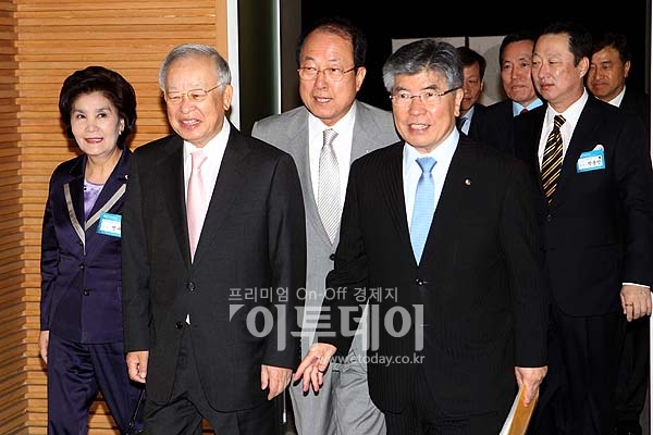 김중수 한국은행 총재(앞줄 오른쪽)와 손경식 대한상공회의소 회장(앞줄 왼쪽)이 18일 오전 남대문로 대한상공회의소에서 열린 조찬간담회에 내빈들과 함께 참석하고 있다.