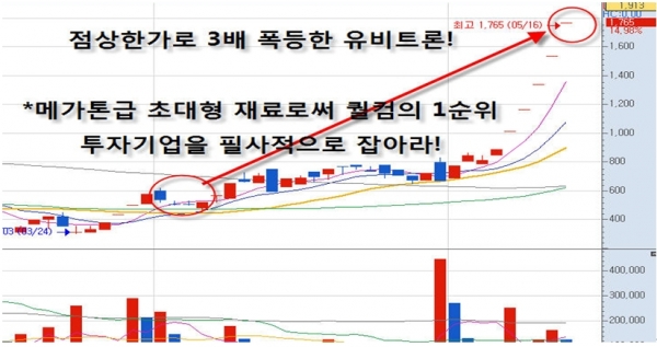 더 이상 말이 필요 없는 종목이다! 유비트론 5연상↑은 맛 배기에 불과한 조선선재 26연상↑처럼 폭발적인 시세가 터지기 전에 반드시 공략하여 그 동안의 모든 서러움과 마음고생도 단번에 씻어버리고 올 한해 대박 수익은 이 한 종목으로 끝내시기 바란다!