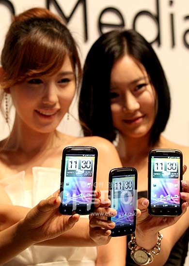 글로벌 스마트폰 제조업체 HTC가 20일 오전 소공동 웨스틴 조선호텔에서 새로운 영상 컨텐츠 서비스 ‘HTC 와치’를 탑재한 스마트폰 ‘HTC 센세이션’을 공개한 가운데 모델들이 제품을 소개하고 있다.