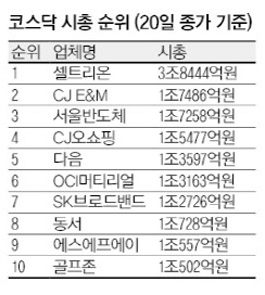 하지만 외국인과 기관의 차익실현 매물이 아지면서 9.43% 급락해 시총 10위로 장을 마감했다. 이에 증시 전문가들은 향후 코스닥 시총 상위주들의 자리싸움이 치열할 것으로 전망했다.