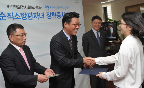 ‘파랑새 장학금’은 현대백화점사회복지재단이 지난 2008년부터 소방방재청의 추천을 받아 선발한 36명의 학생에게 고등학교를 졸업할 때까지 매년 200~300만원씩의 학비를 지원하는 제도다.