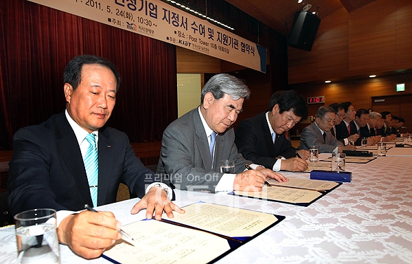 김봉수 한국거래소 이사장(왼쪽)이 24일 오전 중앙우체국 Post Tower 대회의실에서 열린 ‘World Class 300 프로젝트 선정기업 지정서 수여 및 지원기관 협약식’에 참석해 지원기관간 MOU를 체결하고 있다.