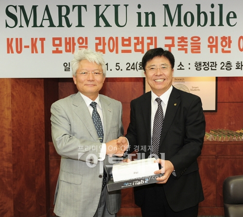 ▲KT 이상훈 사장(오른쪽)과 건국대학교 김진규 총장이 24일 광진구 화양동 건국대학교 행정관에서 열린 아이패드2 도입 기념행사에서 악수를 나누고 있다.