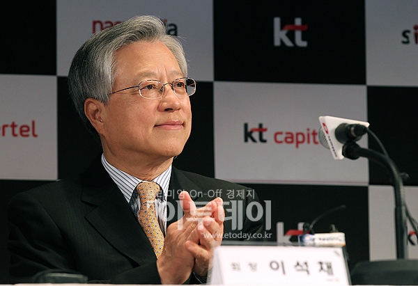이석채 KT 회장이 26일 오전 광화문 KT 올레스퀘어에서 열린 ‘합병 2주년 기자간담회’에 참석해 축하의 박수를 치고 있다.