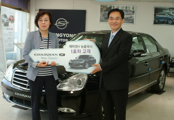 ▲쌍용자동차가 27일 경기 화성에 위치한 발안영업소에서 ‘체어맨 H’ 뉴클래식 1호차 전달식을 갖고 본격적인 출고를 시작했다. 쌍용차 국내영업본부장 송영한 상무(사진 오른쪽)이 1호차의 주인공인 주경기업 대표이사 백현주 사장(사진 왼쪽)에게 체어맨 H 뉴클래식을 전달하고 있다.