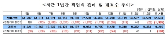 상품 특성별로 보면 장기투자상품의 경우 개인연금와 장기주택마련저축이 각각 171억원, 100억원씩 감소한 반면 연금저축은 528억원 늘었다.