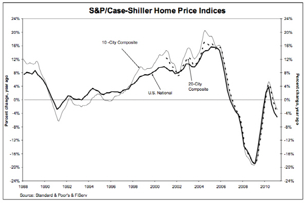 미국 주요 20개 도시를 대상으로 하는 스탠더드앤드푸어스(S&P) 케이스·실러 주택가격지수는 지난 3월 전년 동기 대비 3.6% 하락했다.