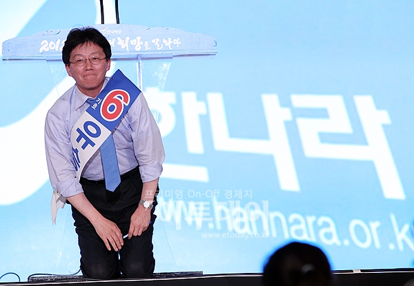 4일 오후 서울 송파구 방이동 올림픽공원 체조경기장에서 열린 한나라당 전당대회에서 당 대표 경선에 나온 유승민 후보가 정견발표에 앞서 당원들에게 큰절을 올리고 있다.