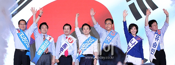 4일 오후 서울 올림픽 체조경기장에서 열린 '한나라당 제12차 전당대회'에서 대표최고위원으로 선출된 홍준표 의원을 비롯한 후보자들이 인사를 하고 있다. 왼쪽부터 원희룡, 권영세, 홍준표, 김수한 선관위원장, 남경필, 박 진, 유승민, 나경원 최고위원.