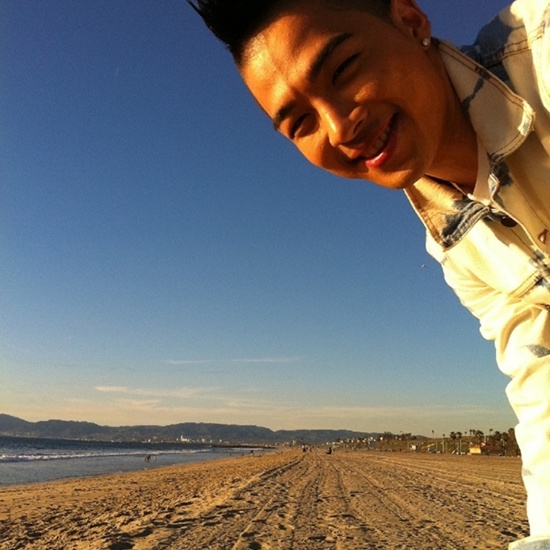 셀카 사진 속 태양은 바닷가에서 길게 펼쳐진 모래사장을 배경으로 카메라를 향해 미소짓고 있다.