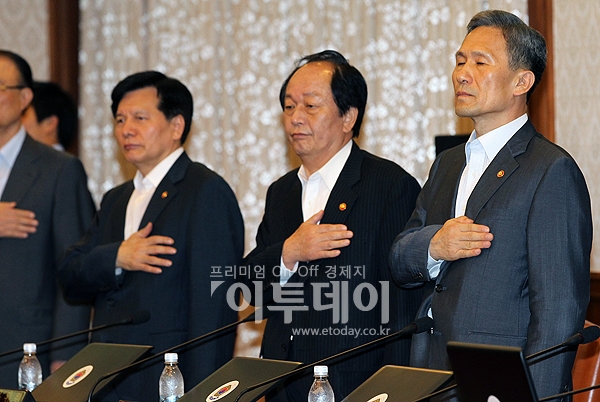 김관진 국방장관이 5일 오전 서울 세종로 정부중앙청사에서 열린 국무회의에 착잡한 표정으로 국민의례를 하고 있다.