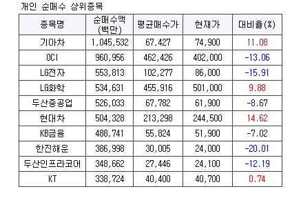 개인 순매수 상위 10개 종목 가운데 절반이 넘는 6개 종목이 마이너스 수익률을 보였다. 그나마 개인이 가장 많이 순매수한 기아차(11.08%)가 선방하면서 손해를 줄일 수 있었지만 두번째, 세번째로 많이 산 OCI(-13.06%)와 LG전자(-15.91%)에서 큰 폭의 손실을 입었다.