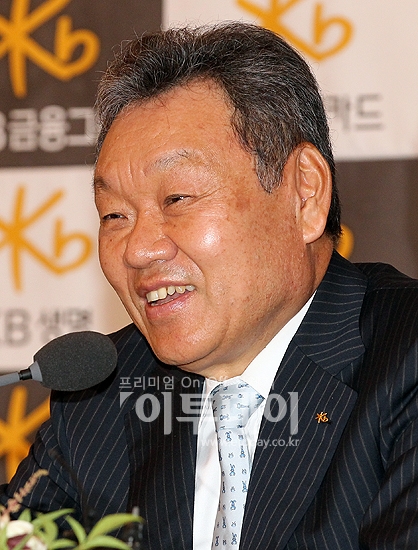 어윤대 KB금융지주회장이 취임 1주년을 앞두고 5일 오후 소공동 조선호텔에서 열린 기자간담회에 참석해 인사말을 하고 있다.