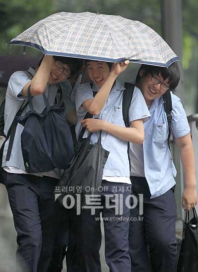 장마전선의 북상으로 서울과 경기지역에도 본격적인 비를 뿌리고 있는 7일 오후 수업을 마친 학생들이 친구들과 우산을 나눠쓰며 여의도 거리를 지나고 있다.
