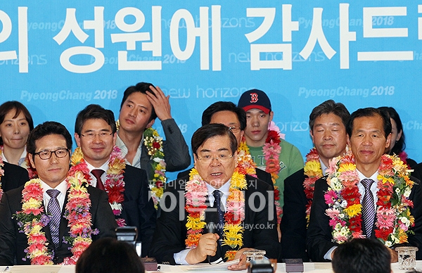 조양호 2018 평창동계올림픽유치위원장(가운데)이 8일 오후 대한항공 전세기편으로 인천공항을 통해 귀국 후 열린 기자회견에서 기자들의 질문에 대답을 하고 있다.