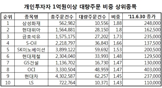 금호석유는 개인의 1억원 이상 주문은 비중이 1.73%으로 3위를 차지했고 S-Oil(1.66%), SK이노베이션(1.53%), OCI(1.47%), 현대차(1.45%)도 10위 안에 포함됐다.