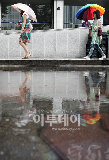 장마전선이 중부지방에 머물면서 이번 주 내내 비소식이 있는 11일 오전 서울 영등포에서 시민들이 물웅덩이가 된 보행로를 피해 걸어가고 있다.