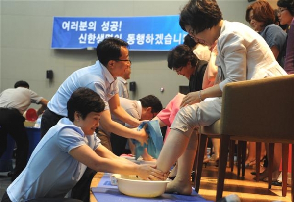 이 날 세족식 행사는 일선현장에서 직접 발로 뛰는 설계사에 대한 섬김과 배려, 세일즈매니저에 대한 신뢰를 모아 한마음으로 하반기에 더 큰 도약을 이뤄나가자는 취지에서 마련됐다고 신한생명측은 밝혔다.