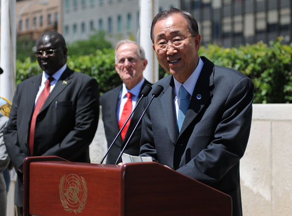 반기문 유엔 사무총장(오른쪽)이 14일(현지시간) 뉴욕 유엔본부 앞에서 남수단의 유엔 가입을 축하하는 연설을 하고 있다. 남수단은 이날 193번째로 유엔에 가입했다. 뉴욕/신화연합뉴스
