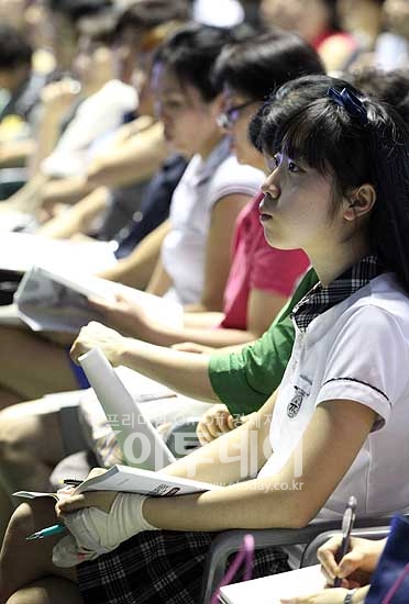 서울특별시교육청이 주최하고 서울특별시교육연구정보원이 주관한 ‘2012 대입 수시전형 대비 학부모 진학설명회’가 18일 오후 잠실학생체육관에서 열렸다. 학부모들과 학생이 강사의 각 대학 수시전형 설명을 집중해서 듣고 있다.
