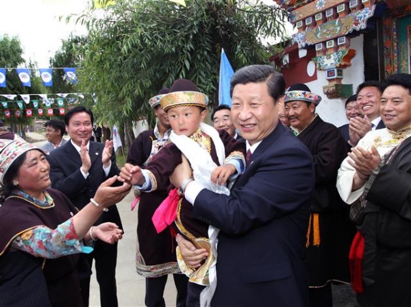 시진핑 중국 부주석이 21일(현지시간) 티베트 닝치 지역을 찾아 어린아이를 안고 함박웃음을 짓고 있다. 시 부주석은 티베트의 중국 편입 60주년을 맞아 티베트를 방문했다. 닝치/신화연합뉴스