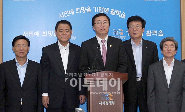 올여름 최악의 전력난이 우려되는 가운데 최중경 지식경제부 장관이 22일 오전 정부과천청사에서 김쌍수 한전 사장, 김종신 한수원 사장 등 발전사 사장단과 하계 전력수급 안정 대국민 담화문을 발표하고 있다.