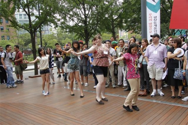 22일 소녀시대와 지상파 공연을 보기 위해 한국관광공사를 방문한 미국 한류팬들이 K-POP에 맞추어 춤을 추고 있다.