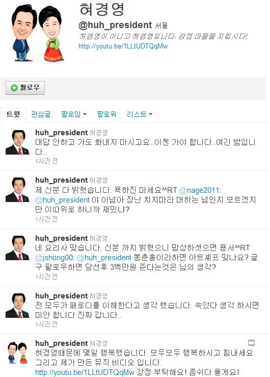 이 트위터는 지난 23일 허경영씨의 이름으로 개설됐다. 당시 진위 여부가 확인되지 않은 채 "2012년 제18대 대선 준비를 시작한다"는 첫 글로 시작됐다.