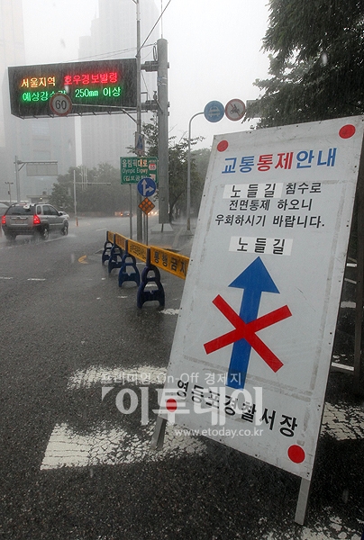 시간당 30mm가 넘는 폭우가 내리고 있는 27일 오전 서울 여의도의 노들길이 통제되어 있다.