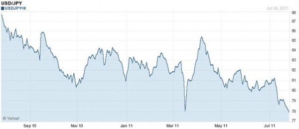 미국의 재정위기를 배경으로 투기 세력들이 달러를 팔고 엔을 사면서 엔화 가치가 겉잡을 수 없이 치솟고 있다. 월말을 맞아 수출기업들이 수중의 외화를 엔으로 교환하기 시작하면서 또 다른 엔고 요인이 되고 있다.