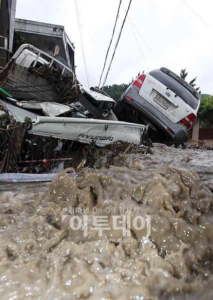27일 오후 폭우로 인해 인근 저수지 둑이 무너져 내려 큰 피해를 입은 서울 서초구 우면동 형촌마을 골목에는 파손된 차량들이 뒤엉켜 있다.