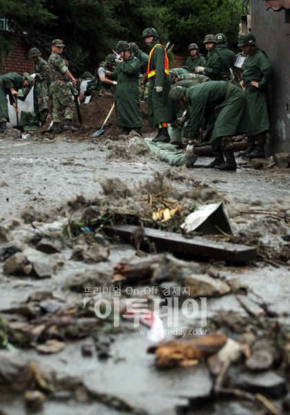 인근 육군부대원들이 27일 오후 폭우로 인해 인근 저수지 둑이 무너져 내려 큰 피해를 입은 서울 서초구 우면동 형촌마을에서 복구작업을 하고 있다.