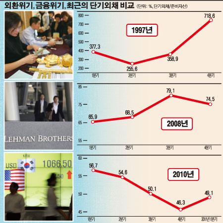 단기외채 비율은 지난 2008년 당시 80%대까지 오르며 위기설이 고개를 드는데 영향을 미쳤다. 1997년 외환위기 때는 단기외채 비율은 718.6%까지 치솟았다.