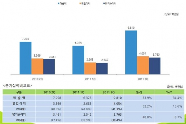 2분기의 괄목할 성장세는 스마트폰 게임과 해외 시장에서의 매출 확대가 배경으로 분석된다. 스마트폰 게임 매출은 전분기 대비 119%, 전년 동기 대비 259%의 성장세로 61억 원을 기록, 분기 매출의 절반이 넘는 62%를 차지했다.