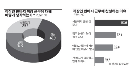 취업포털 잡코리아의 설문조사에 따르면 직장인 1891명을 대상으로 ‘남성 직장인들이 반바지를 입고 근무하는 것에 대해 어떻게 생각하느냐’라는 질문에 48.3%가 ‘찬성한다’고 답했다. ‘반대한다’는 응답은 31.5%, ‘상관없다’는 의견은 20.1%로 나타났다.