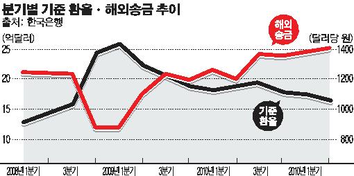 해외송금은 지난 2001년 2분기 처음으로 10억달러를 돌파했다. 이후 꾸준한 증가 추세를 보이면서 2008년 1분기 20억달러를 넘어섰다. 하지만 글로벌 금융위기가 발생하면서 원화값이 급락하자 해외송금도 급격히 줄었다.