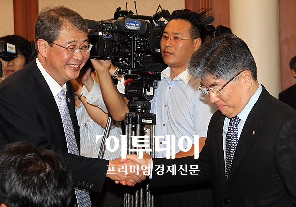 [포토]악수하는 김중수 한은 총재와 임종룡 기재부 차관