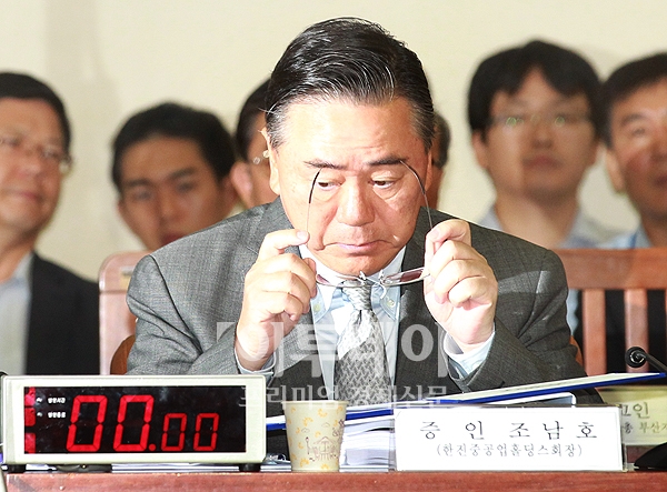 조남호 한진중공업 회장이 18일 오전 국회 환경노동위원회에서 열린 한진중공업 사태 관련 청문회에 증인으로 참석해 난감한 표정으로 안경을 고쳐 쓰고 있다.