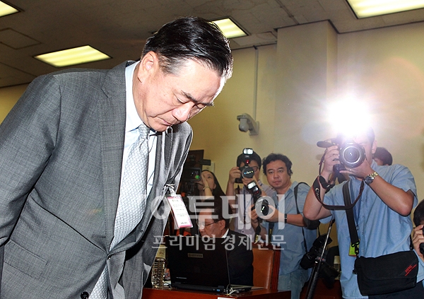조남호 한진중공업 회장이 18일 오전 국회 환경노동위원회에서 열린 한진중공업 사태 관련 청문회에 증인으로 참석해 고개숙여 인사를 하고 있다.