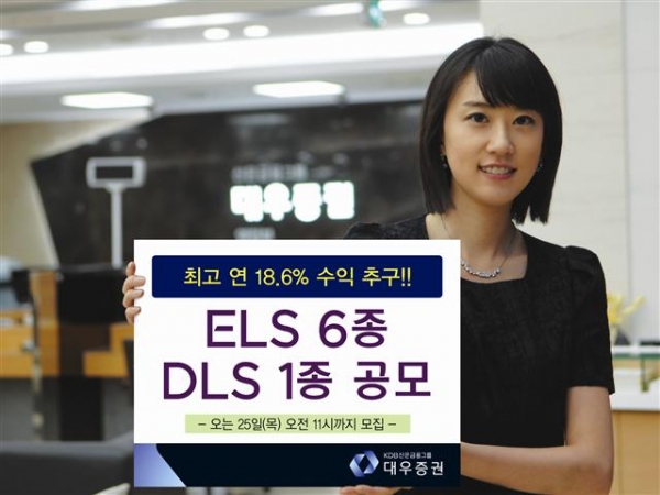 대우증권은 최고 연 18.6%의 수익을 추구하는 주가연계증권(ELS) 6종과 기타파생결합증권(DLS) 1종을 오는 25일까지 공모한다고 23일 밝혔다. 이번 상품은 KOSPI200, 홍콩항생중국기업지수(HSCEI), 현대중공업, 현대차, POSCO, 호남석유, OCI, 현대모비스, 미국달러화가격을 기초자산으로 하며 총 350억원 규모로 모집한다.