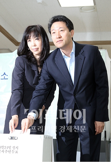 서울시 무상급식 주민투표일인 24일 오전 오세훈 서울시장이 종로구 혜화동 자치회관에 마련된 제2투표소를 찾아 부인 송현옥씨와 투표하고 있다.